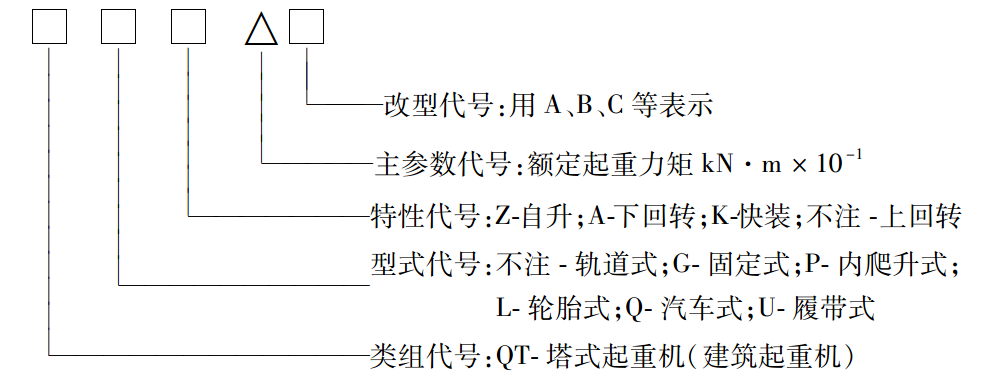 塔式起重機(jī)的型號(hào)由類(lèi)、組、型、特性、主要參數(shù)及改型代號(hào)組成如下: