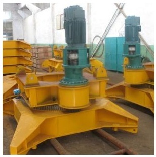 4)行走機(jī)構(gòu)。由行走臺(tái)車(chē)和驅(qū)動(dòng)裝置組成。四個(gè)雙輪臺(tái)車(chē)裝在擺動(dòng)支腿的端部,并可繞垂直軸轉(zhuǎn)動(dòng)。其中兩個(gè)帶有行走動(dòng)力的臺(tái)車(chē)布置在軌道的同一側(cè),電機(jī)通過(guò)液壓耦合器和行星擺線針輪減速器及一對(duì)開(kāi)式齒輪驅(qū)動(dòng)車(chē)輪。行走機(jī)構(gòu)和回轉(zhuǎn)機(jī)構(gòu)的電動(dòng)機(jī)與減速器之間用液力耦合器連接,運(yùn)動(dòng)比較平穩(wěn)。