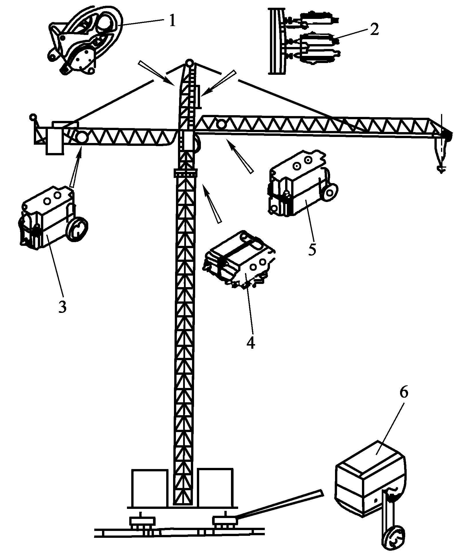 1力矩限制器;2起重量限制器;3起升高度限位器;4回轉(zhuǎn)限位器;5幅度限位器;6行走限位器
