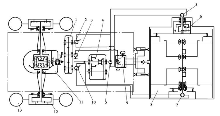 1-分動(dòng)箱;2-行走驅(qū)動(dòng)軸向柱塞泵;3-轉(zhuǎn)向及風(fēng)扇用雙聯(lián)齒輪泵;4-變速箱;5-行走驅(qū)動(dòng)定量馬達(dá);6-行星減速器;7-振動(dòng)驅(qū)動(dòng)定量馬達(dá);8-振動(dòng)輪;9-液壓轉(zhuǎn)向器;10-振動(dòng)驅(qū)動(dòng)變量泵;11-驅(qū)動(dòng)橋;12-輪邊行星減速器;13-輪胎