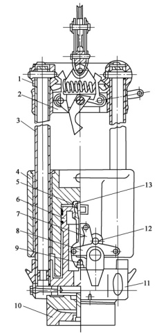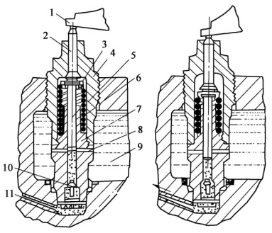 1-曲臂;2-頂桿;3-彈簧座;4-彈簧套;5-柱塞;6-柱塞彈簧;7-泵體;8-吸油口;9-燃油箱;10-單向閥;11-出油道