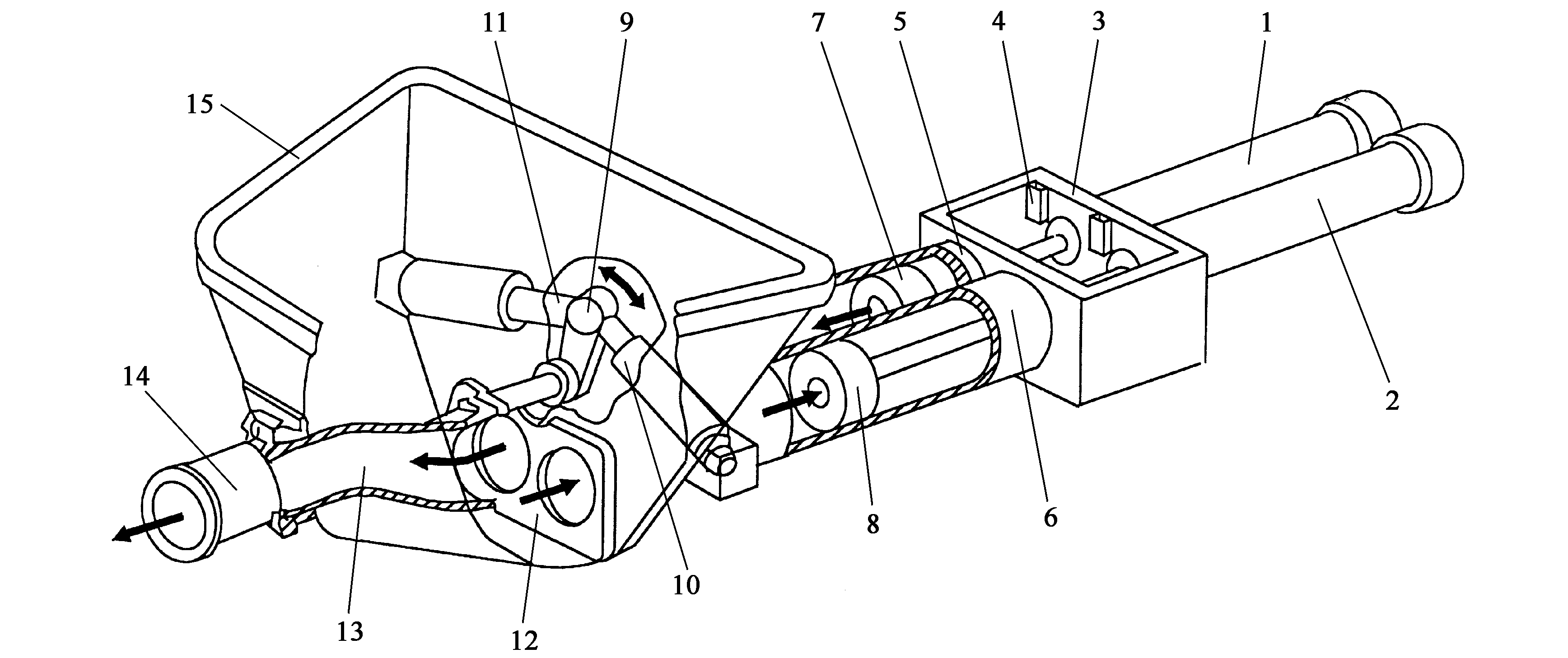 泵送機構主要由兩只主油缸1、2、水箱3、換向機構4、兩只混凝土缸5、6、兩只混凝土缸活塞7、8、擺臂9、兩只擺動油缸10、11、分配閥13(又稱S管)、出料口14和料斗15等組成。