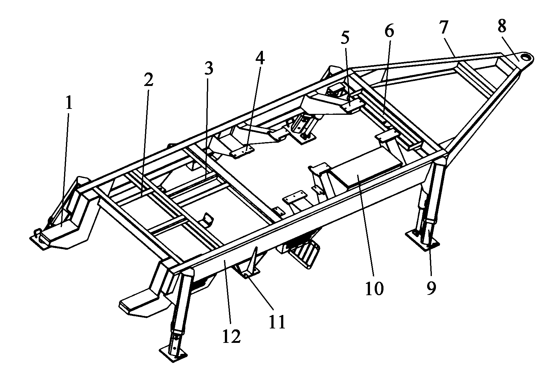 5柴油機安裝座;6電瓶箱座;7導向輪安裝板;8拖架;9活動支腿;