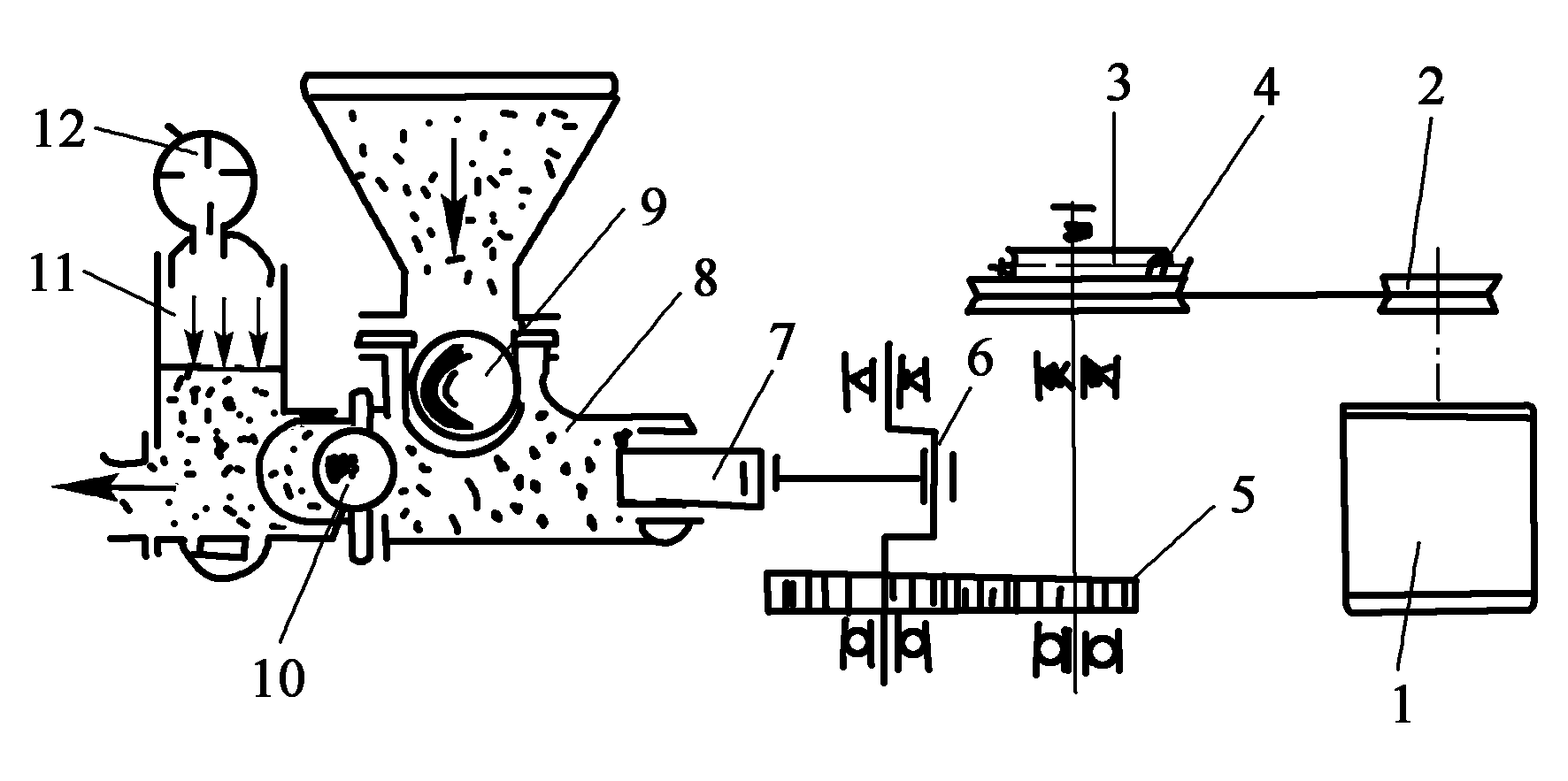 1氣罐;2料斗;3電動機;4減速器;5曲柄連桿機構;6三通閥;7輸出口